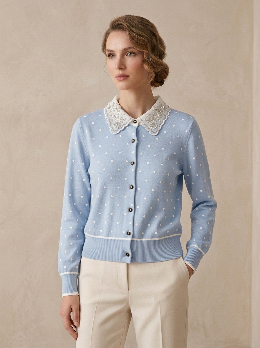 Ce cardigan raffiné se distingue par son col en dentelle délicate qui apporte une touche élégante et romantique.