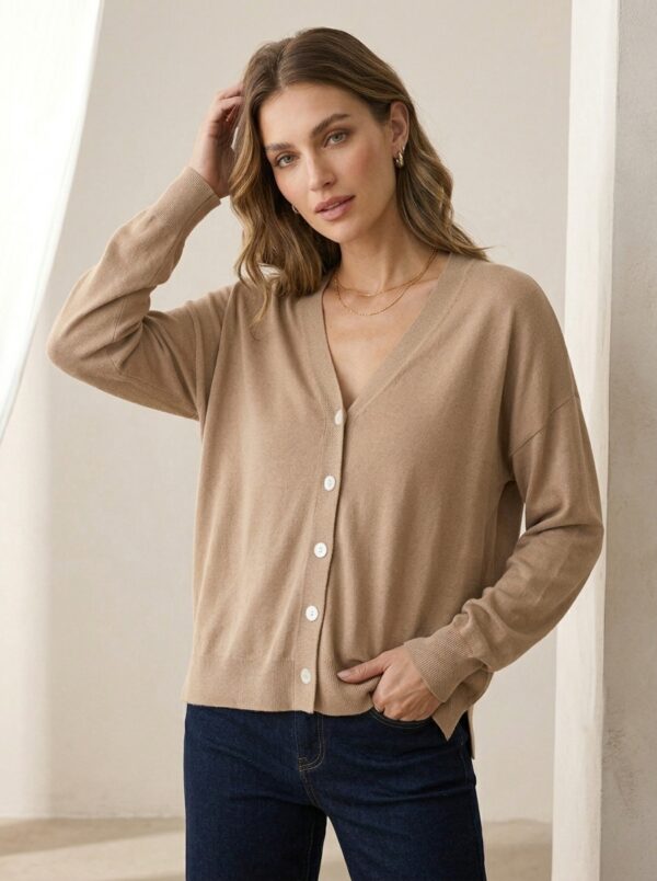 Ses boutons discrets et son col en V apportent une touche élégante et féminine.