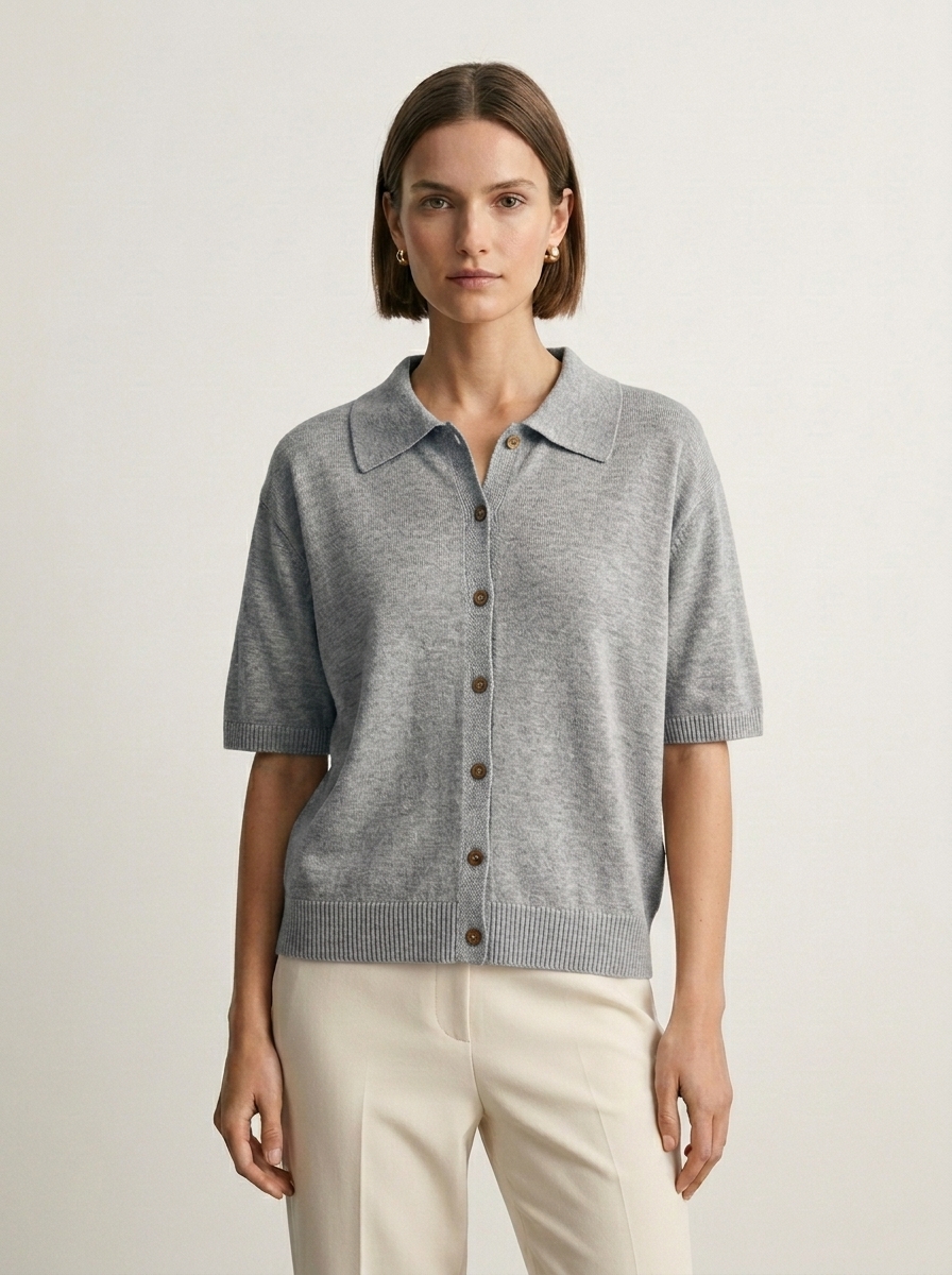 Ce cardigan style polo en maille douce séduit par sa coupe épurée et son confort au quotidien.