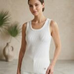 Ce débardeur en maille côtelée séduit par sa coupe ajustée et son style épuré.