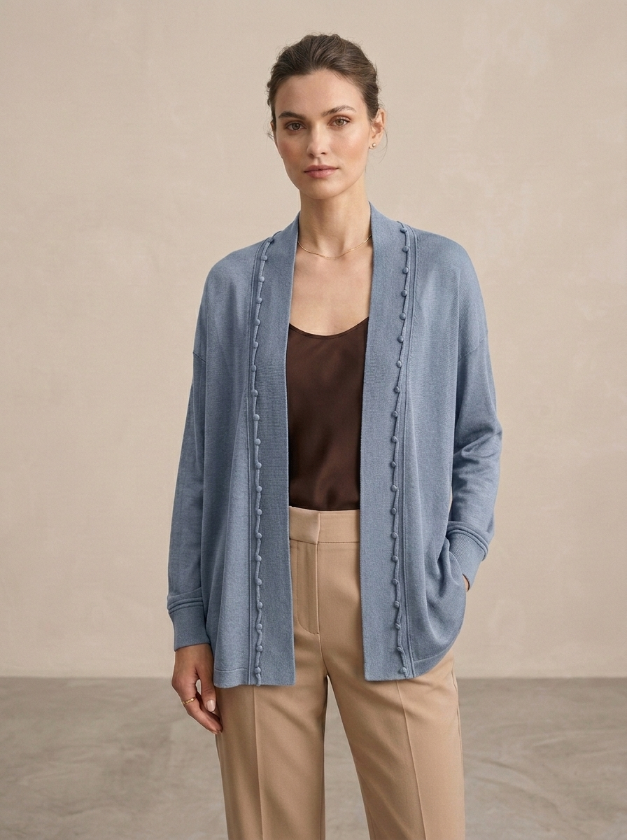 Ce gilet long en maille fine séduit par sa coupe fluide et son design épuré.