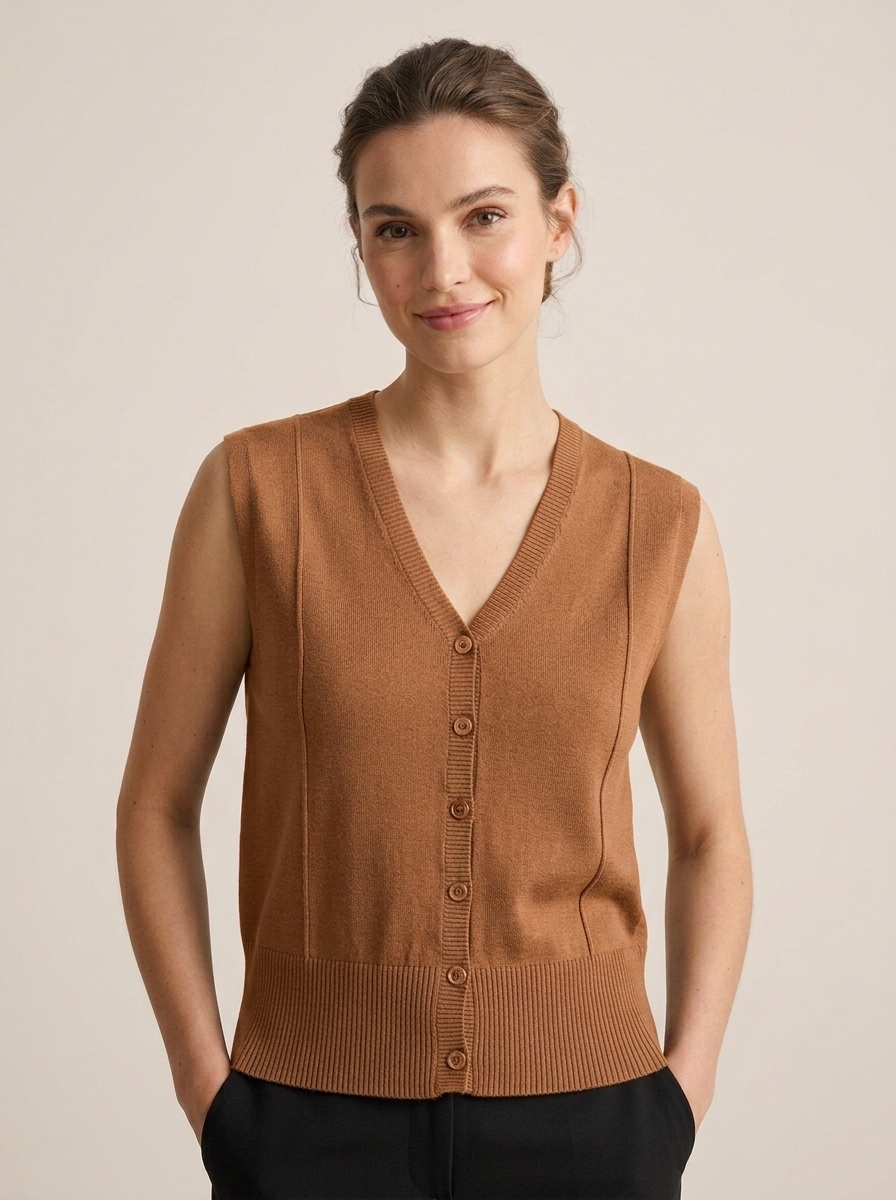 Ce gilet en maille sans manches séduit par sa coupe épurée et son col en V intemporel.