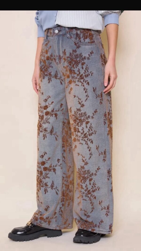 Ce pantalon large en denim se distingue par son imprimé floral élégant qui apporte une touche unique et moderne.
