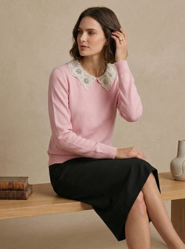 Ce pull en maille douce séduit par son col en dentelle délicate qui apporte une touche raffinée et féminine.