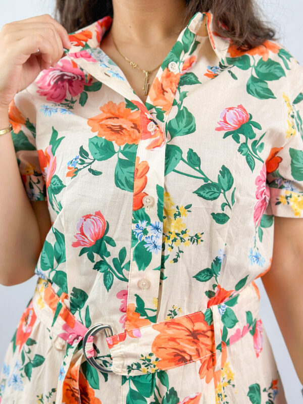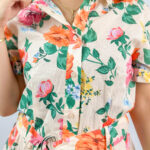 Cette robe longue incarne la fraîcheur et la joie de vivre grâce à son imprimé floral multicolore sur fond crème. Confectionnée dans un tissu léger et agréable à porter, elle présente une coupe chemise moderne avec des manches à nœuds et une ceinture à nouer qui souligne la taille. Son design combine confort et élégance, parfait pour les journées ensoleillées ou les balades d’été.