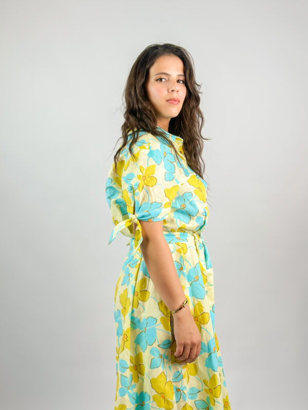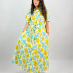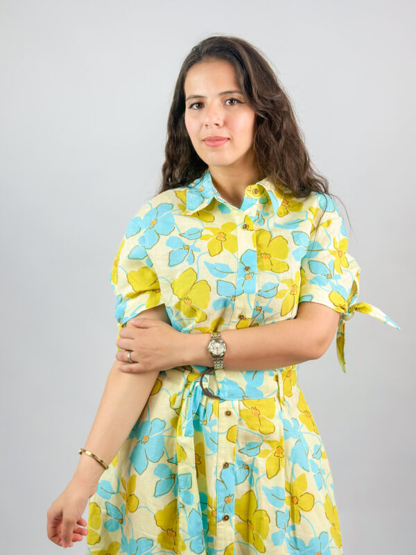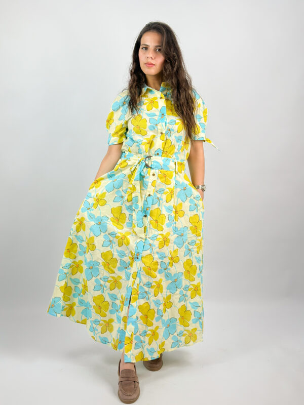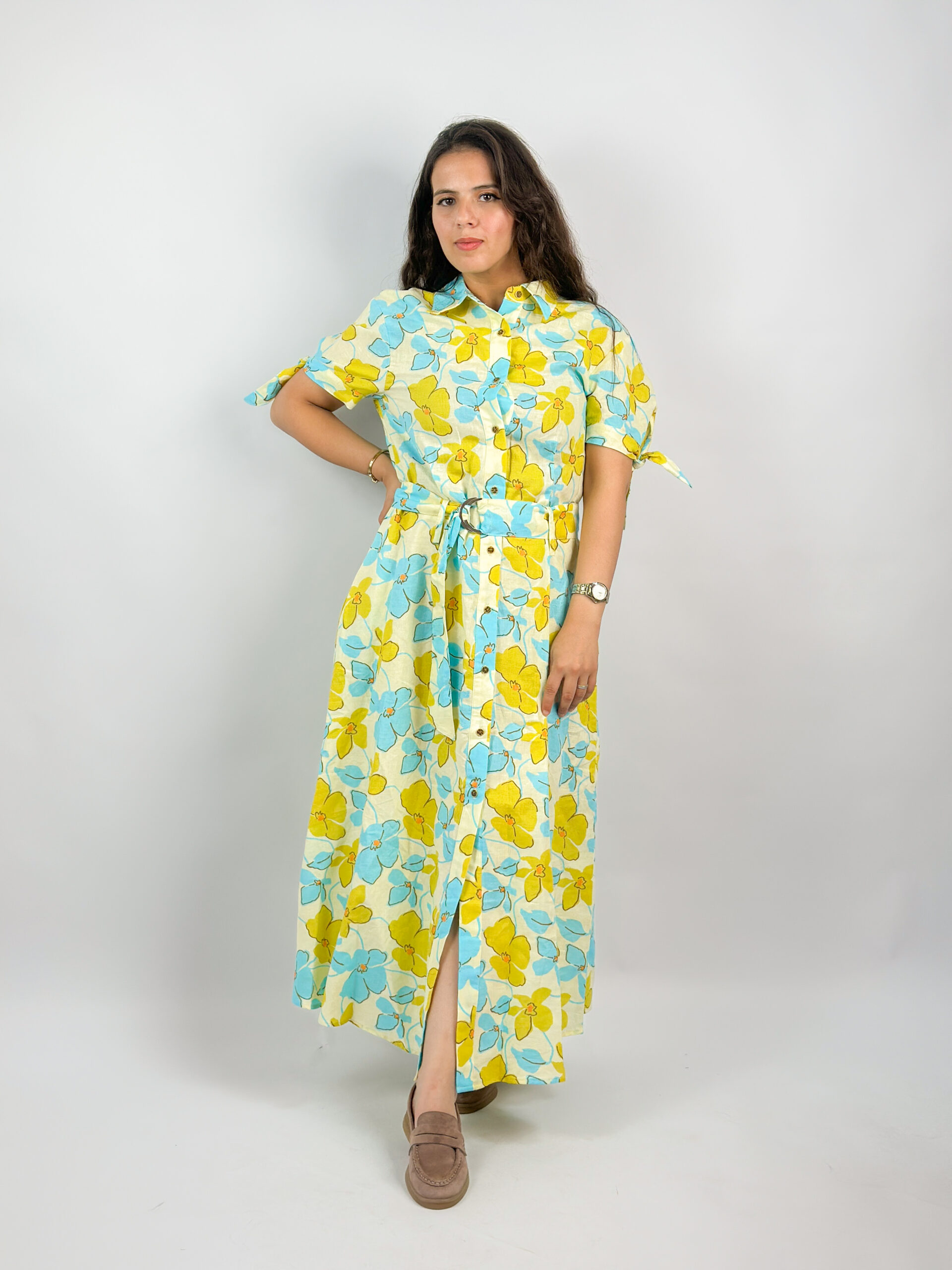 Ajoutez une touche de fraîcheur à votre garde-robe avec cette robe chemise florale, idéale pour les beaux jours. Sa coupe longue fluide et sa ceinture assortie mettent la silhouette en valeur, tout en garantissant un confort optimal. Les fleurs bleu ciel et jaune soleil apportent un style lumineux et joyeux, parfait pour une journée décontractée ou une sortie estivale.