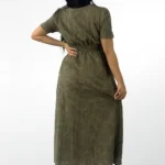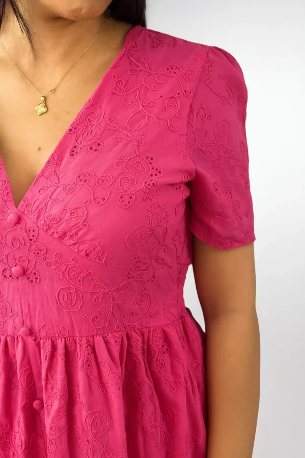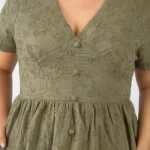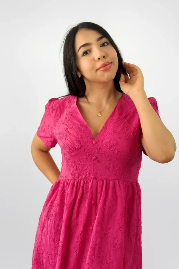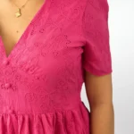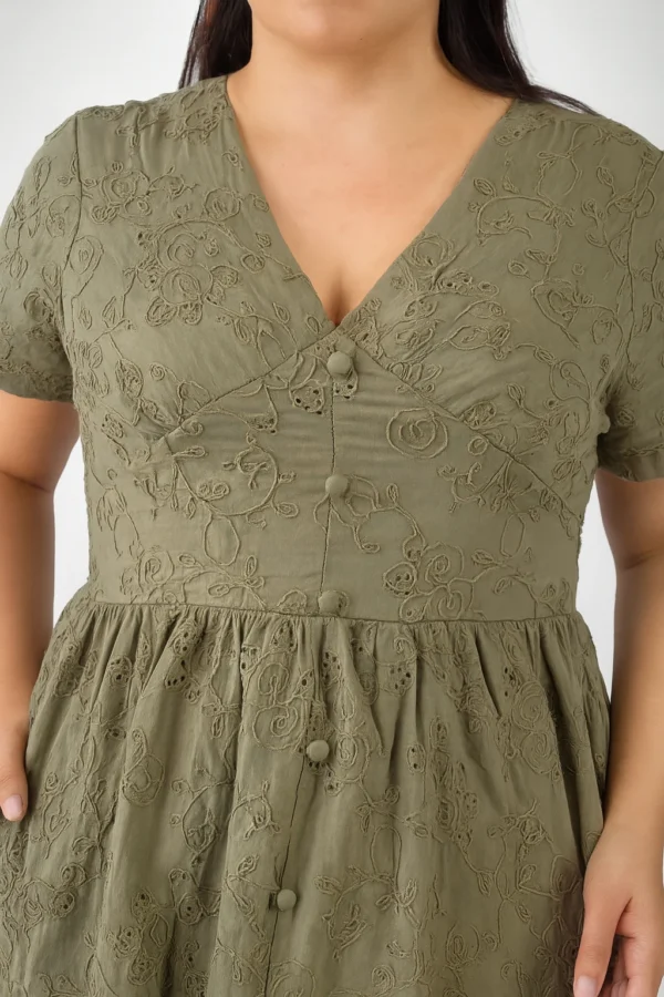 Les broderies ton sur ton délicatement travaillées apportent une richesse visuelle sans être trop voyantes. Les boutons recouverts de tissu à l’avant accentuent le style raffiné et féminin de la robe. À l’arrière, une bande élastiquée assure un maintien confortable et un ajustement parfait.