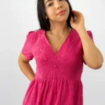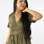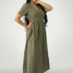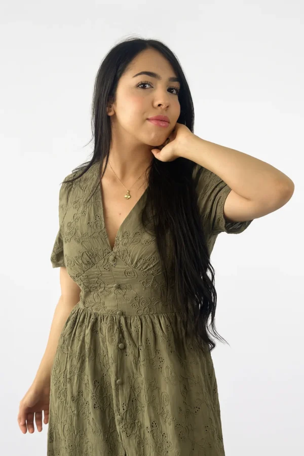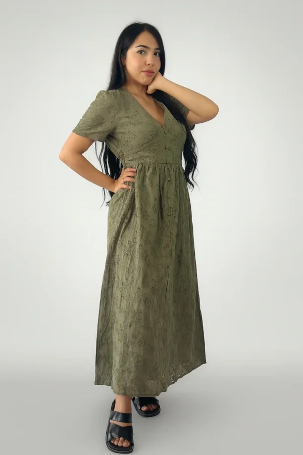 Robe longue brodée en coton léger, col en V flatteur, manches courtes et coupe empire : le choix parfait pour un look féminin et confortable, idéal pour le printemps et l’été.