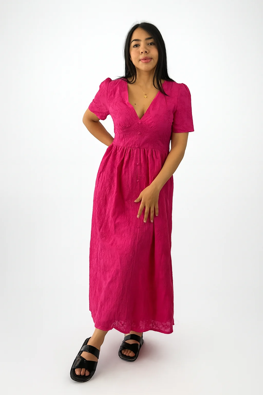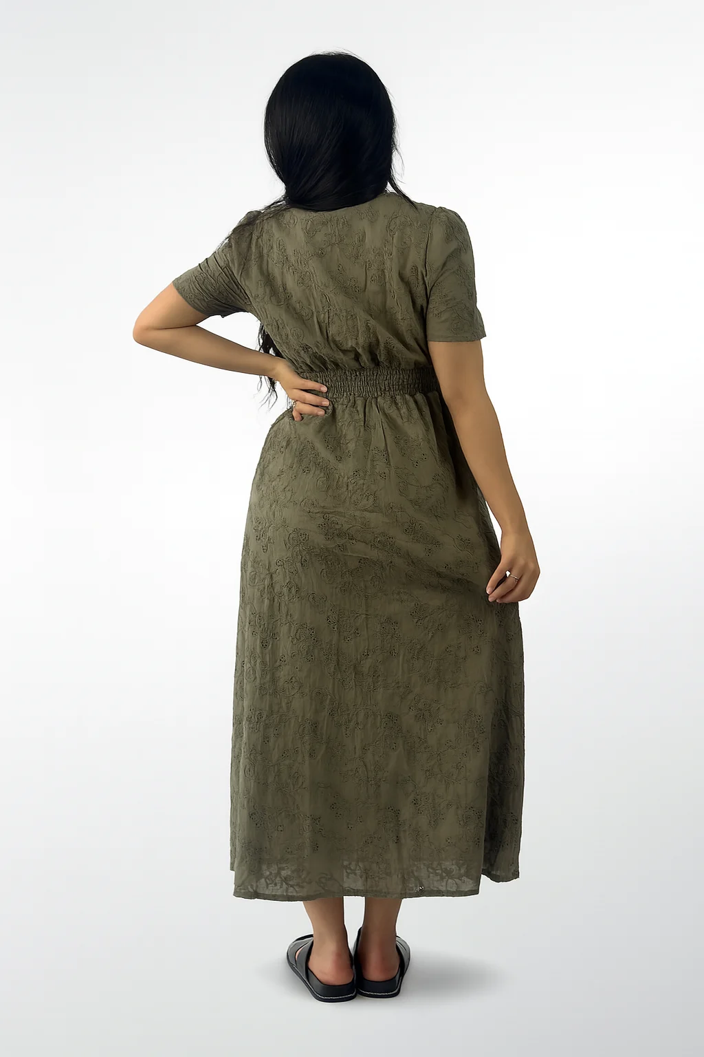 Robe longue brodée en coton léger, col en V flatteur, manches courtes et coupe empire : le choix parfait pour un look féminin et confortable, idéal pour le printemps et l’été.