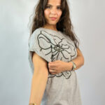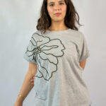 Ce t-shirt gris clair se distingue par une grande fleur noire brodée en relief sur l’épaule et la poitrine. Avec sa coupe ample et confortable, il est idéal pour un look casual chic sans effort. Les manches légèrement retroussées apportent une touche moderne et décontractée.