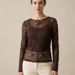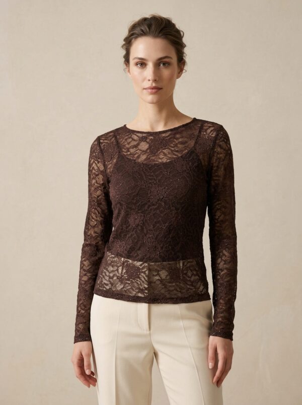 Ce top en dentelle fine se distingue par sa transparence subtile et son motif délicat.