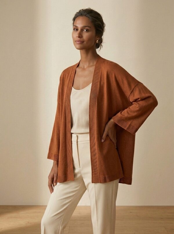 Cette veste style kimono séduit par sa coupe fluide et son design épuré.